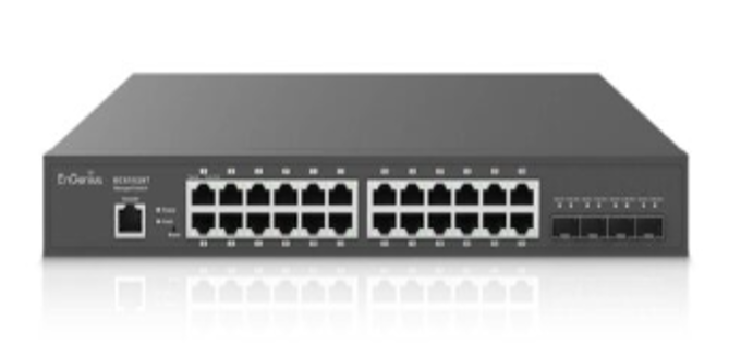 Bộ chuyển mạch kèm phụ kiện Engenius ECS1528T có thiết kế 24 cổng Gigabit và 4 cổng uplink SFP+ đáng tin cậy và dễ quản lý, cung cấp kết nối tốc độ cao cho các thiết bị mạng của doanh nghiệp.