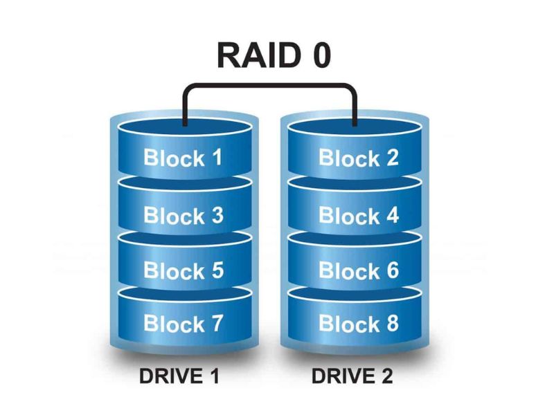RAID 0 cần tối thiểu 2 ổ cứng cùng loại (Disk 0, Disk 1), ví dụ bạn có file dữ liệu A dung lượng 200MB. Trong quá trình lưu trữ RAID sẽ phân mỗi ổ đĩa là 100MB thay vì bỏ hết vào một ổ cứng, chính điều này giúp giảm một nửa thời gian làm việc so với lý thuyết.