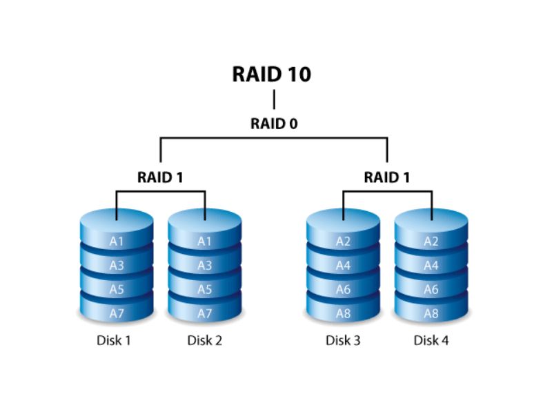Đây là sự kết hợp giữa RAID 1 và RAID 0, hệ thống RAID 10 đòi hỏi cần được trang bị tối thiểu 4 ổ cứng (Disk 0, Disk 1, Disk 2, Disk 3). Nguyên tắc của RAID 10 là dữ liệu sẽ được lưu đồng thời trên cả 4 ổ cứng, 2 ổ dạng Striping (tách luồng dữ liệu thành những khối với kích thước nhất định) và 2 ổ dưới dạng Mirroring (kỹ thuật lưu trữ bằng cách sao lưu dữ liệu).