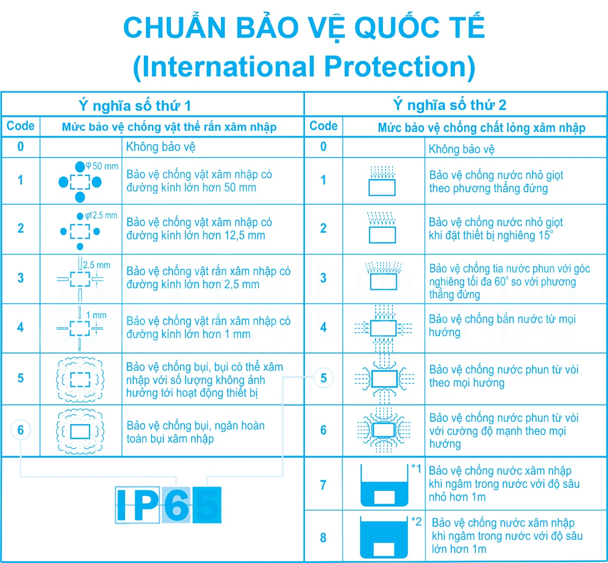 Tiêu chuẩn IP 65 có nghĩa là: -Khả năng chống bụi: Bảo vệ chống bụi, ngăn hoàn toàn bụi xâm nhậm; -Khả năng kháng nước: bảo vệ chống nước phun từ vòi với cường độ mạnh theo mọi hướng